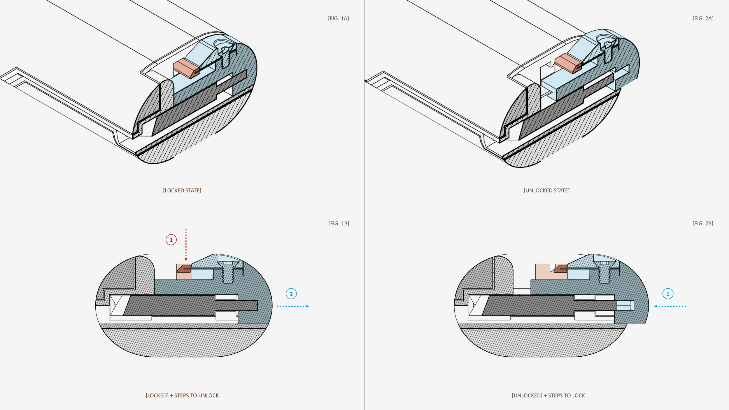 [ABOVE] Cross-sectional drawings of the blade lock mechanism, illustrating the knife in its locked and unlocked state. A two-stage latch-channel detent mechanism was selected and developed based on design drivers around improving ergonomics, simplifying usability, and risk reduction (user safety).