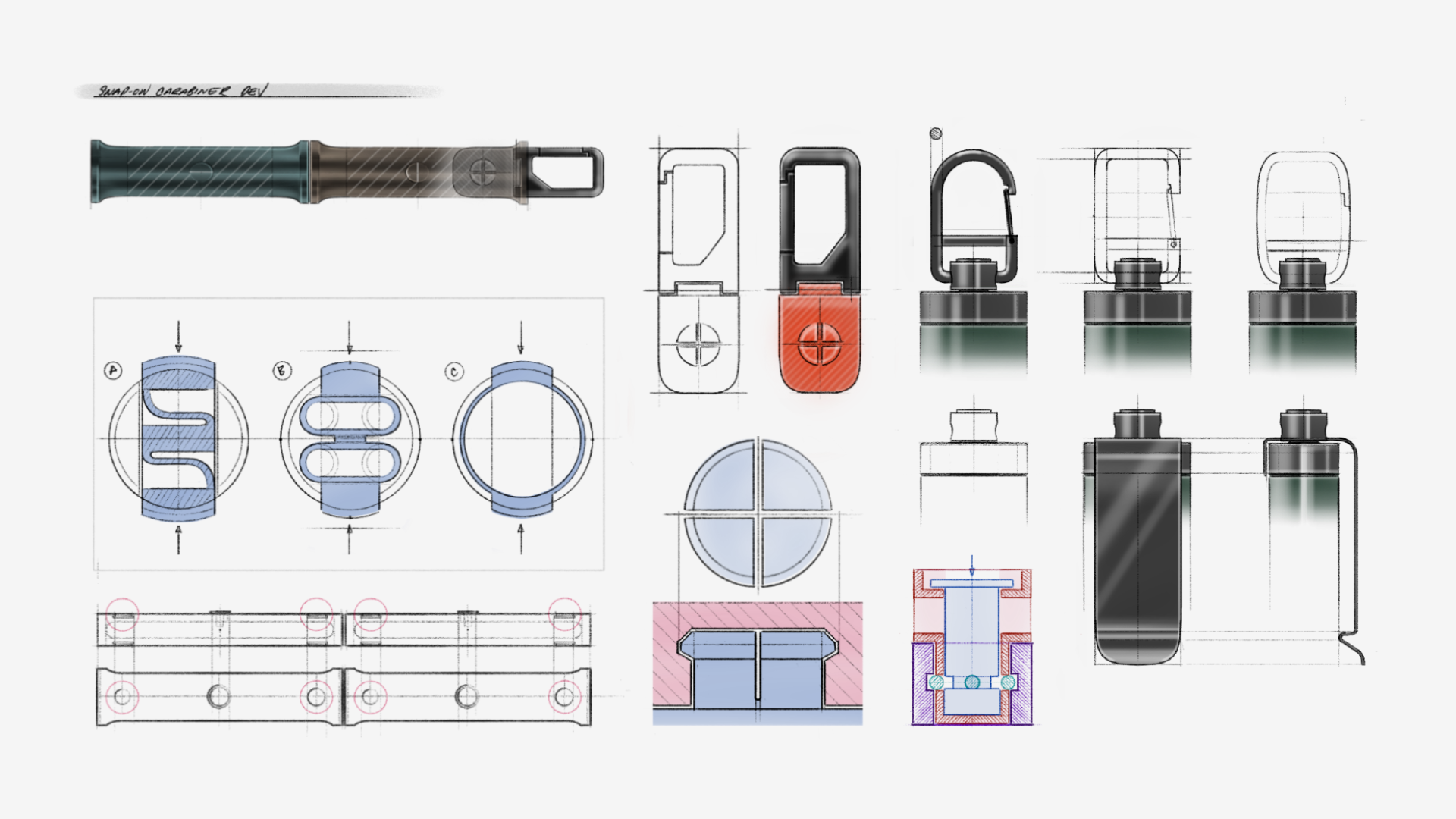 Carabiner Carry Accessory Subassembly [WIP]. The carabiner body was designed with a 2D profile to reduce part complexity, manufacturing operations, and cost. (*Revisions planned to simplify assembly hardware and approach).